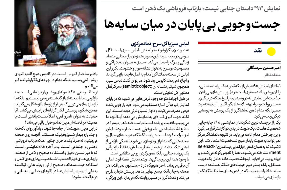 نکتهی مهم دیگر، ارائهی نمایشنامهی چاپشده به تماشاگران پیش از ورود به سالن است. این ژست که به نظر میرسد دعوت به مشارکت ذهنی یا خوانش تطبیقی است، در عمل بیثمر میماند. اجرا نه وفادار به متن است، نه از آن فاصله میگیرد. نه میتوان نمایش را یک بازآفرینی دانست، نه یک بازنویسی. فقط روایتی مبهم و متزلزل است که حتا نسبت خودش با متن مبدأ را هم نمیداند.