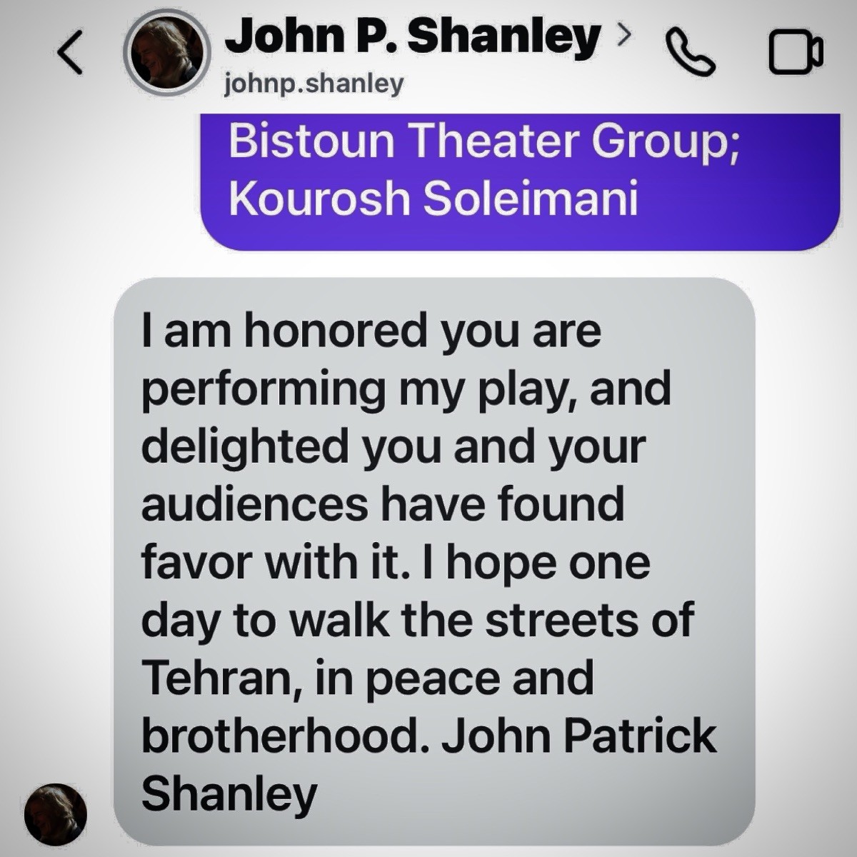 بازهم از دعوت شما سپاسگزارم ... و نیز از تیوال عزیز که بستری برای این تعاملات فراهم ساخته و از اعضای گروه مان؛ ساناز و محمد حسن و حمید و علی که مرا همراهی کردند، ممنونم ... و در آخر ممنون از پیگیری فرزاد جعفریان ، همکاران حراست مجموعه ایرانشهر و ممنون از کافه ایرانشهر که صبورانه تا نیمه شب پذیرای ما بود … در پناه حق، پاینده باشید …