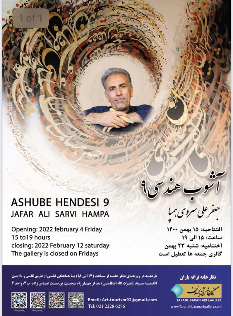 به گزارش روابط عمومی این نمایشگاه؛«آشوب ۹» عنوان نهمین نمایشگاه انفرادی جعفر علی سروی است و در این نمایشگاه مجموعه جدیدترین نقاشی خط های «جعفرعلی سروی همپا» که با تکنیک اکرولیک و ترکیب مواد بر روی بوم خلق شده اند، در معرض دید مخاطبان قرار می گیرد.