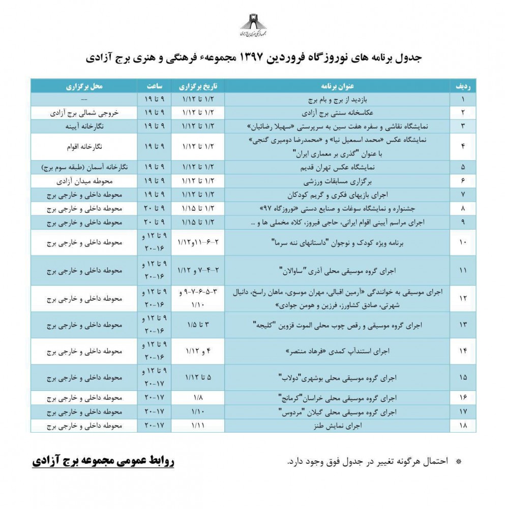 ویژه برنامه های بهارانه مجموعه برج آزادی از دوم تا دوازدهم فروردین ۹۷ از ساعت ۹ صبح تا ۲۰ عصر در میدان و برج آزادی برگزار می شود.
