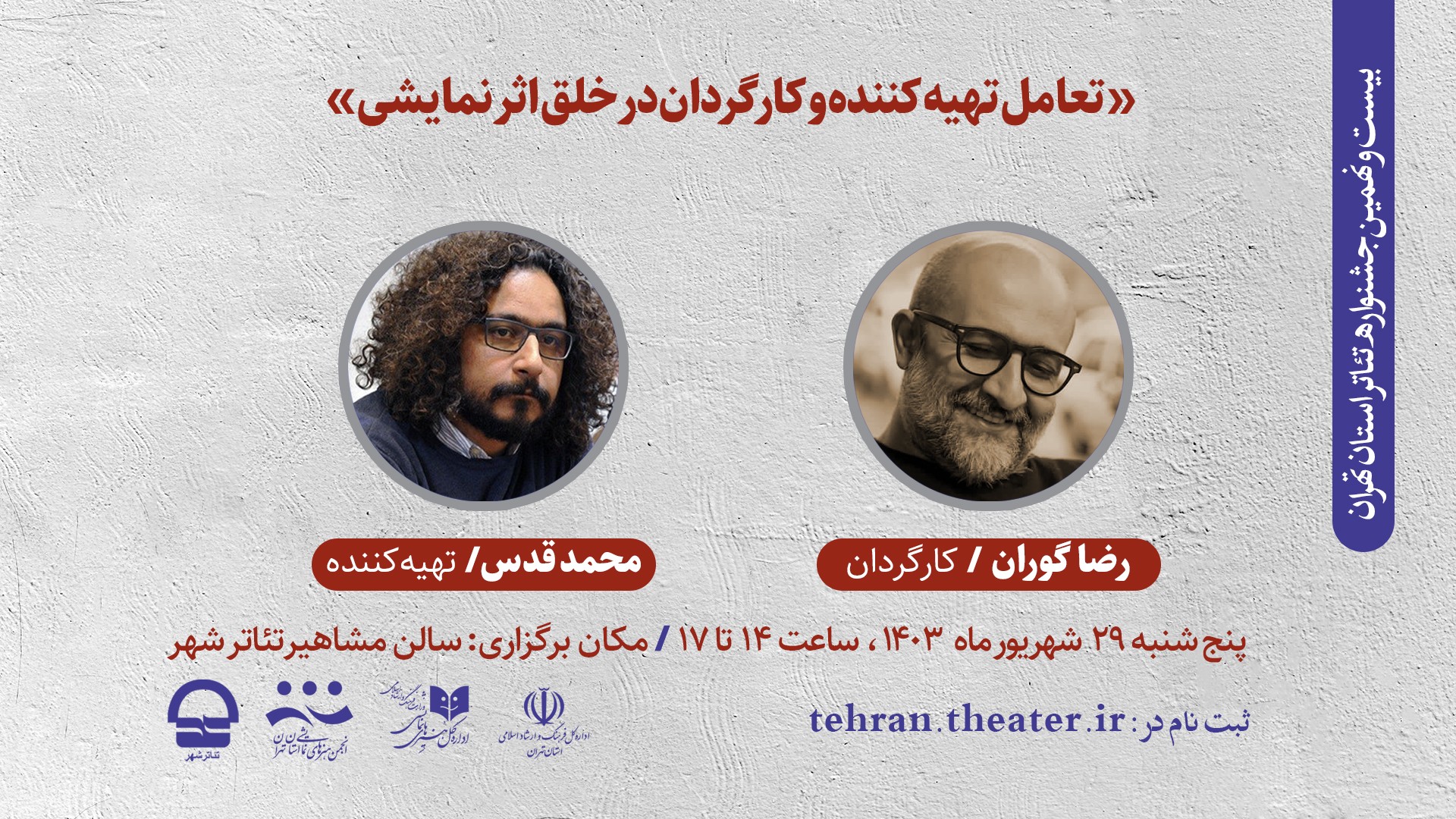 کارگاه «تعامل تهیه کننده و کارگردان در خلق اثر نمایشی» با حضور رضا گوران و محمد قدس در بیست و نهمین جشنواره تئاتر استان تهران برگزار میشود.