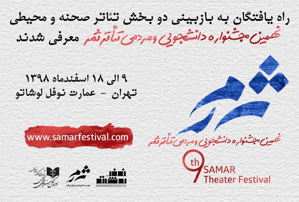 نهمین جشنواره دانشجویی و مردمی تئاتر ثمر به دبیری دکتر رضا دادویی نهم تا هجدهم اسفند ماه سال ۱۳۹۸ در بخشهای مختلف «تئاتر صحنه»، «تئاتر محیطی»، «نمایشنامه نویسی»، «عکس ثمرنگار، پوستر و تیزر» و «مهمان» ویژه دانشجویان و هنرمندان در عمارت نوفل لوشاتو برگزار خواهد شد.