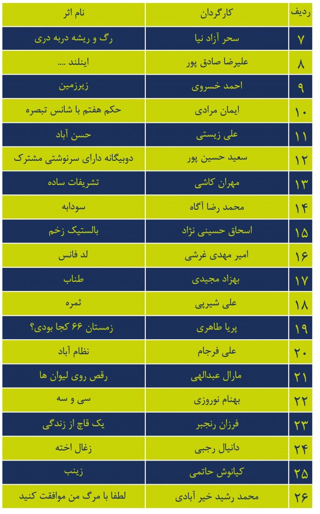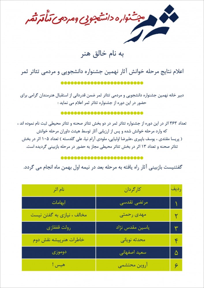 برای دسترسی به اسامی آثار راه یافته به بازبینی «بخش تئاتر صحنه » و دفاع از ایده «بخش تئاتر محیطی » اینجا را کلیک کنید.