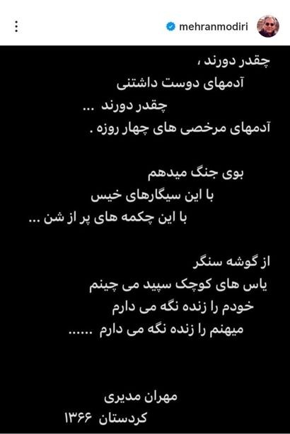مهران مدیری کارگردان، هنرپیشه، خواننده، مجری، طراح صحنه و لباس، مجری طرح، صداپیشه و تهیهکننده. از جمله مجموعههای تلویزیونی که وی در آنها کارگردان و بازیگر بوده میتوان سریالهای: ساعت خوش، پاورچین، جنگ ۷۷، پلاک ۱۴، نقطهچین، شبهای برره، باغ مظفر، نود شب، مرد هزارچهره، مرد دوهزارچهره، قهوه تلخ، ببخشید شما، ویلای من، شوخی کردم، در حاشیه و در حاشیه ۲ را نام برد.