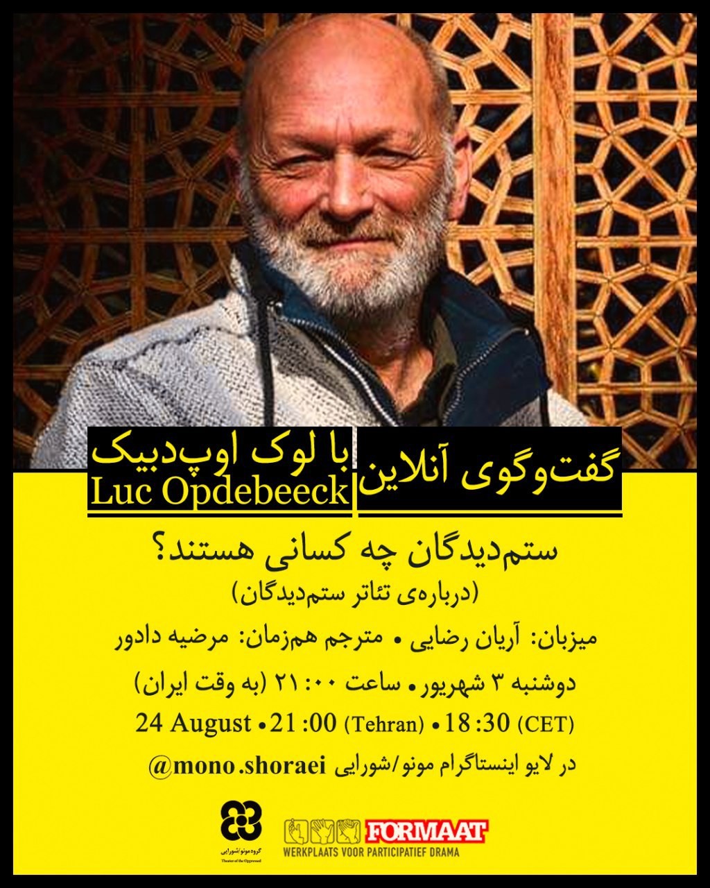 گفت وگوی آنلاین با عنوان "ستمدیدگان چه کسانی هستند؟" به میزبانی آریان رضایی فعال تئاتر ستمدیدگان در ایران و لوکاوپدبیک مدیر هنری فرمات (Formaat) در کشور هلند روز دوشنبه سوم شهریور ساعت ۲۱ در لایو اینستاگرام مونو/شورایی @mono.shoraei برگزار میشود. این گفتوگوی آنلاین به طور همزمان توسط مرضیه دادور به زبان فارسی ترجمه خواهد شد.