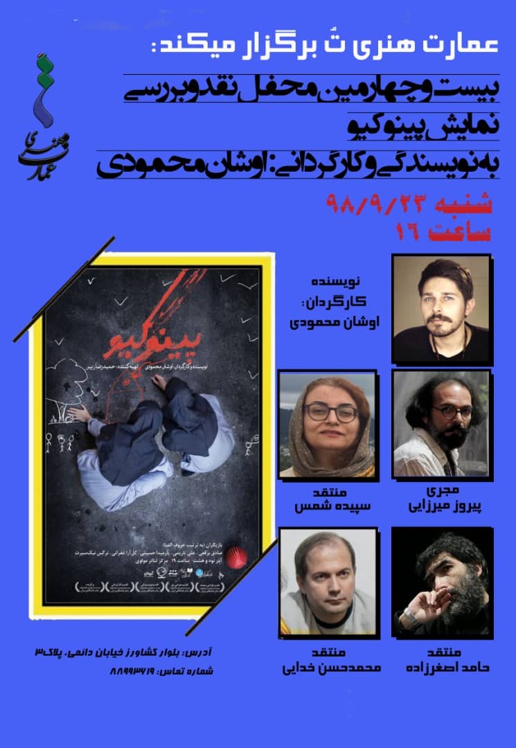 بیستوچهارمین محفل نقد تئاتر روز شنبه ۲۳ آذرماه ساعت ۱۶ میزبان کارگردان، بازیگران و عوامل نمایش "پینوکیو" است تا با حضور سه منتقد تئاتر ، سپیده شمس، حامد اصغرزاده و محمدحسین خدایی نقد و بررسی شود.