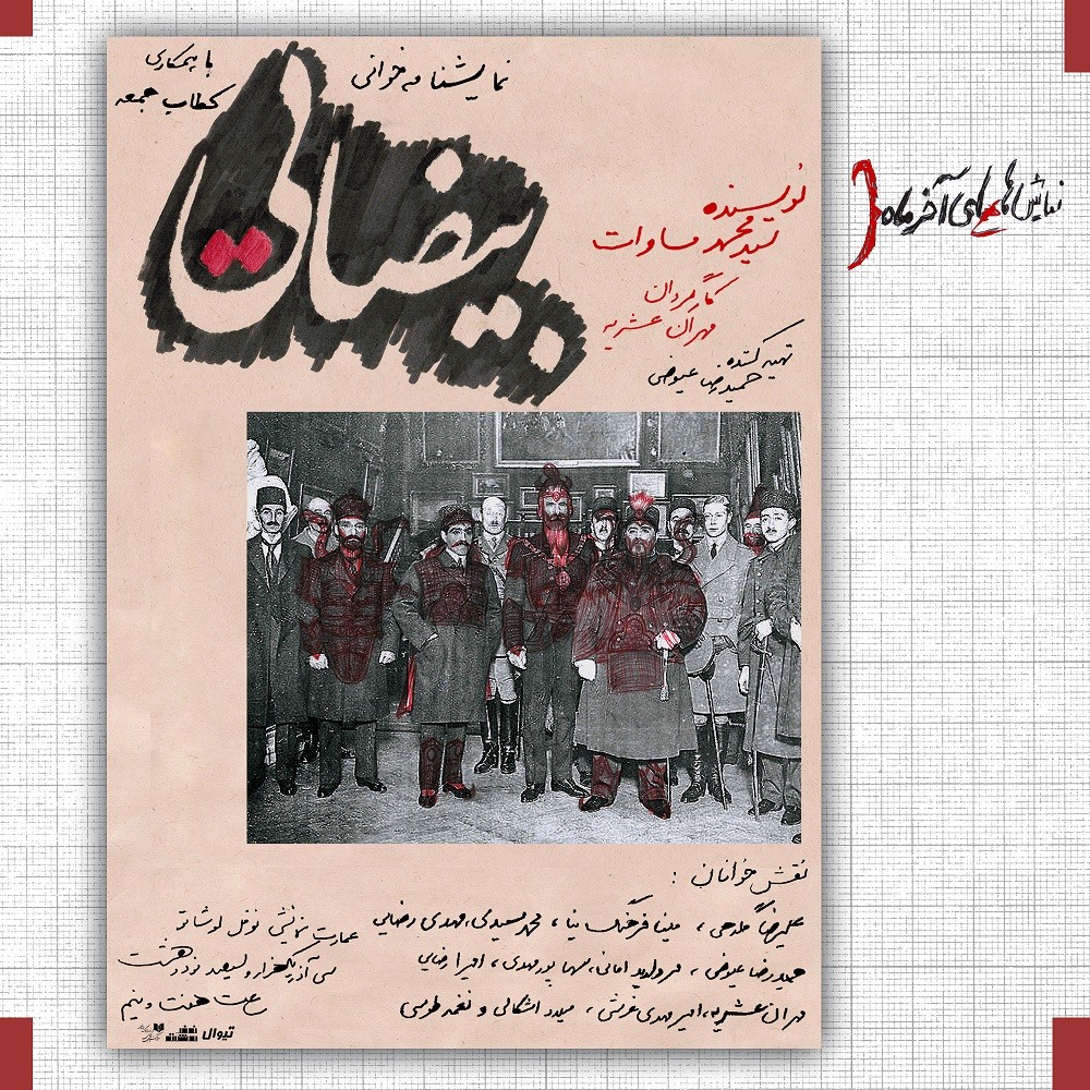 «بیضایی» سید محمد مساوات؛ دومین نمایشنامهخوانیِ نمایشهای آخر ماه«بیضایی» به نویسندگی سید محمد مساوات، دومین نمایشنامهخوانیِ نمایشهای آخر ماه است که سیام آذرماه ۱۳۹۸ در عمارت نمایشی نوفللوشاتو نمایشنامهخوانی میشود.نمایشهای آخر ماه نامی است که شنبههای آخر ماه، به نمایشنامهخوانیِ آثار برجستۀ نمایشی میپردازد.