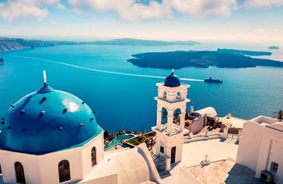 جزیره سانتورینی در صدر لیست زیباترین و مجلل ترین جزیره های جهان قرار گرفته است. این جزیرهدر حدود ۳۶۰۰ سال پیش یک فوران عظیم آتشفشانی را شاهد بودهاست. در طول سالیان و قرنهای بعدی، یونانیان بر لبه تیز این آتشفشانهای بلند، روستاهایی را بنا نهادند که زیباییش در کنار آبی دلانگیز خلیج آن چشم هر بینندهای را به خود معطوف میکند. در کنار خانههای سفید این جزیره میتوان به گنبدهایی آبی که بر روی صخرههای شیبدار ساخته شدهاند نیز اشاره کرد.