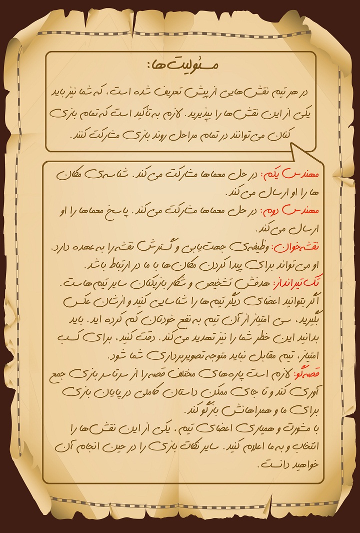 شروع برنامه: محل مختص تیم شما در بوستان عباسآباد، تا شب قبل از بازی به شما از طریق تلگرام اعلام خواهد شد. همچنین توضیحات و قوانین بازی به تلگرام شما ارسال میشود.