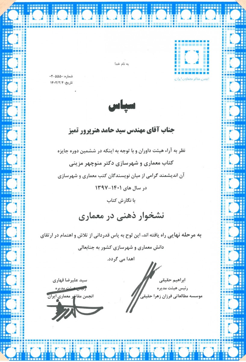 این اثر در ششمین دوره مسابقه کتاب سال معماری و شهر سازی دوسالانه مرحوم مزینی در آبان سال ۱۴۰۲ موفق به دریافت جایزه و لوح سپاس از انجمن مفاخر معماری ایران گردید.