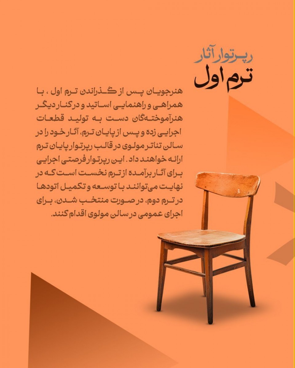 لازم به ذکر است که پس از برگزاری رپرتوار ترم دوم، اثر منتخب در صورت کسب تایید کیفی جهت اجرای عموم به سالن تیاتر مولوی معرفی خواهد شد.