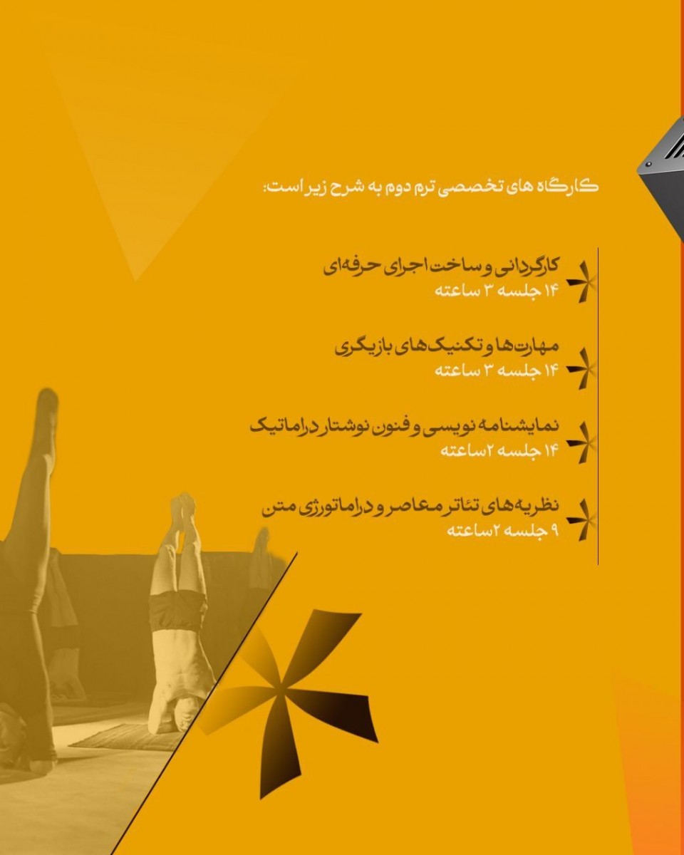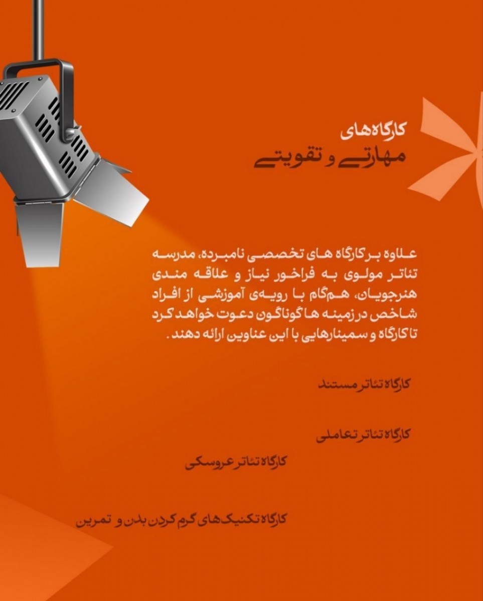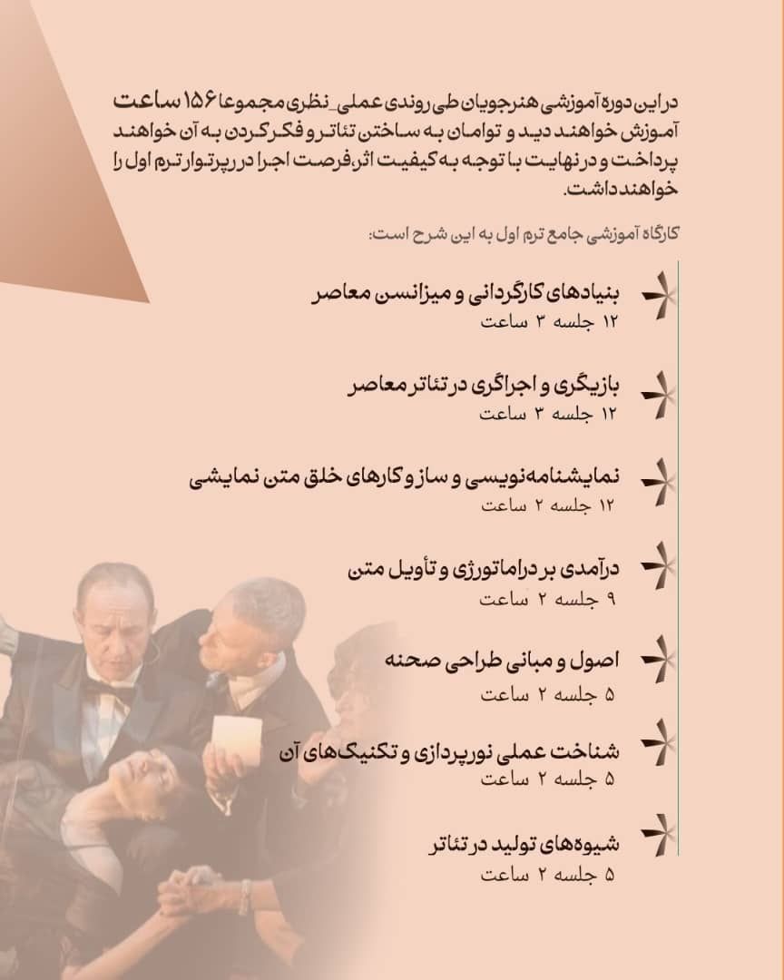 این دوره بر دو زمینهی تولید متن و اجرای صحنهای متمرکز خواهد بود و هنرجویان بنا بر ذوق و تواناییشان میتوانند در کارگاه ها شرکت کنند.