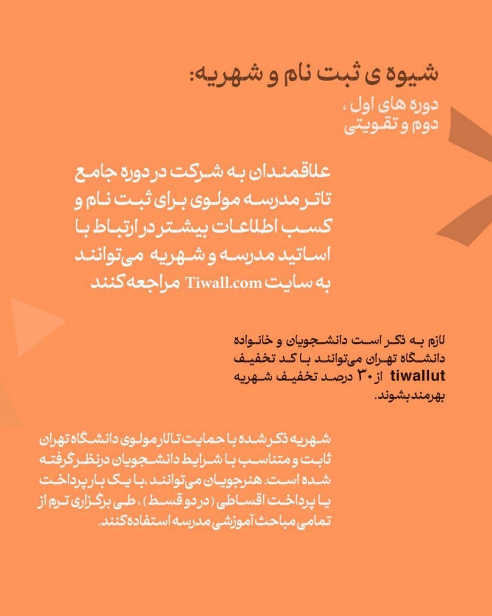 لازم به ذکر است که فقط دانشجویان دانشگاه تهران میتوانند با کد تخفییف tiwalltehran از ۳۰٪ تخفیف شهریه این مدرسه بهره مند شوند.