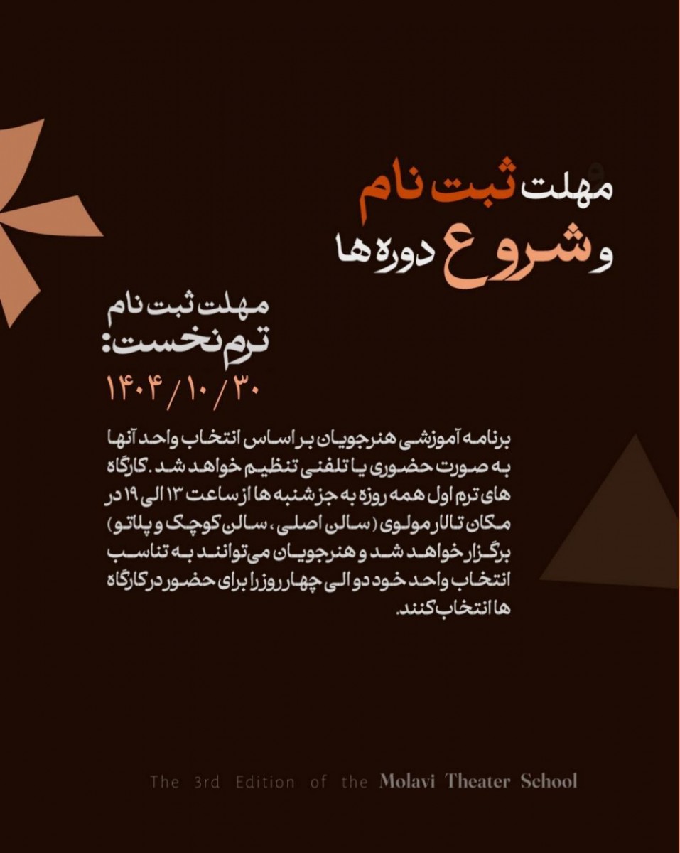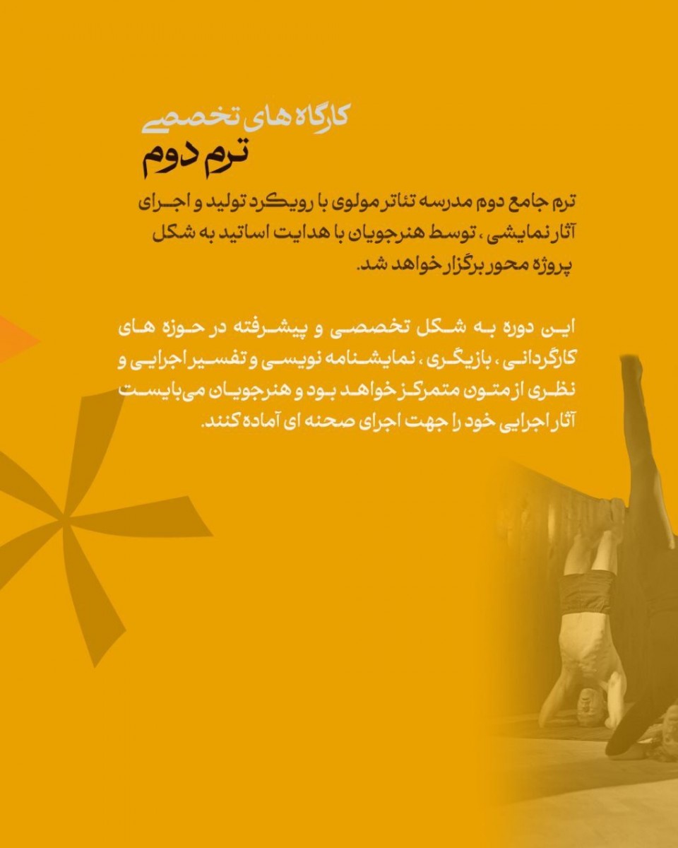 ترم دوم مدرسهی تئاتر مولوی با رویکردِ تولید و اجرای آثار نمایشی، توسط هنرجویان و با هدایت مدرسین صورت خواهد گرفت.