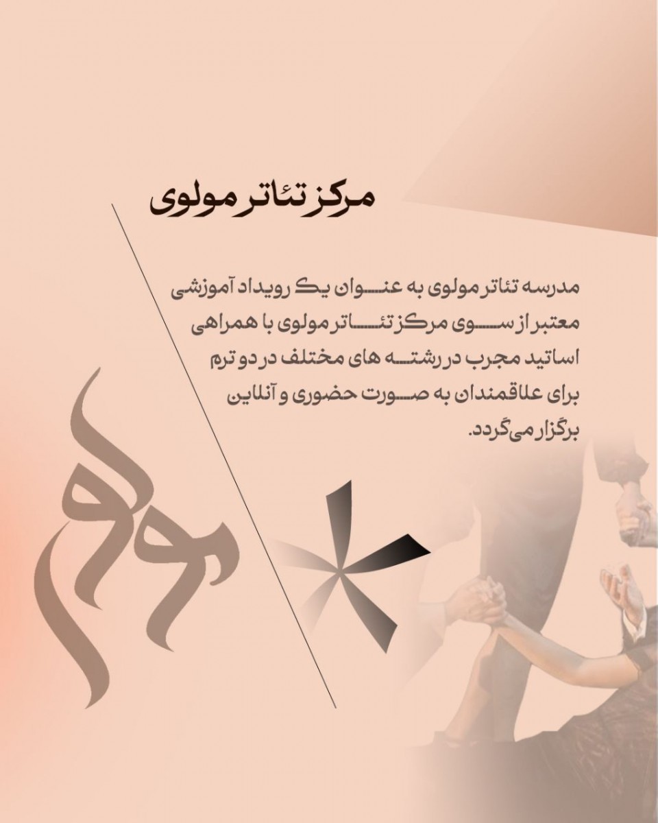 مدرسه تئاتر مولوی به عنوان یک رویداد آموزشی معتبر از سوی مرکز تئاتر مولوی دانشگاه تهران، در دو ترم برای علاقهمندان به صورت حضوری و آنلاین برگزار میشود.