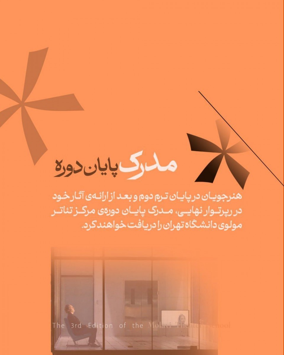 تمامی هنرجویان حضوری و آنلاین پس از حضور مستمر و پایدار (کمتر از 3جلسه غیبت در هر کلاس) در کارگاهها و شرکت در رپرتوار نهایی ترم دوم، مدرک معتبر پایان دوره از سوی مرکز تئاتر مولوی دانشگاه تهران دریافت خواهند کرد.