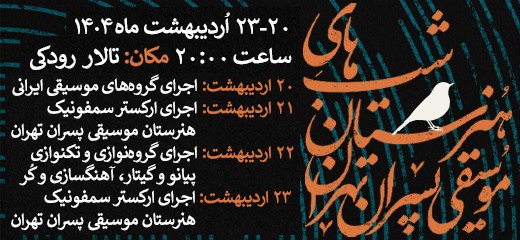 ۲۰ اردیبهشت: اجرای گروههای موسیقی ایرانی ۲۱ اردیبهشت: اجرای ارکستر سمفونیک هنرستان موسیقی پسران تهران ۲۲ اردیبهشت: اجرای گروهنوازی و تکنوازی پیانو و گیتار، آهنگسازی و گروه کر ۲۳ اردیبهشت: اجرای ارکستر سمفونیک هنرستان موسیقی پسران تهران