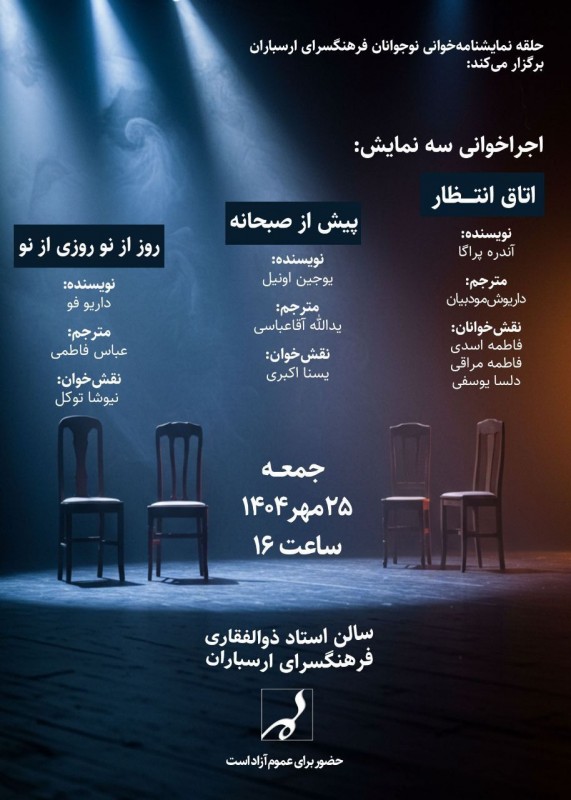 حلقه نمایشنامهخوانی نوجوانان فرهنگسرای ارسباران، روز جمعه ۲۵ مهرماه سه نمایش را اجراخوانی خواهد کرد.