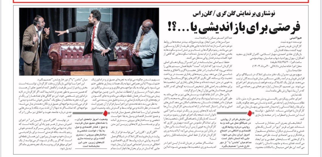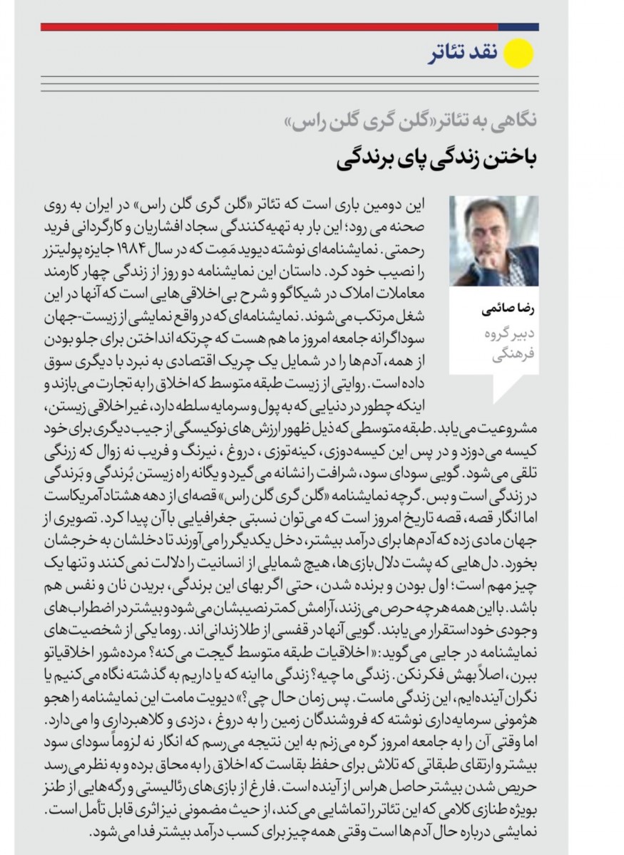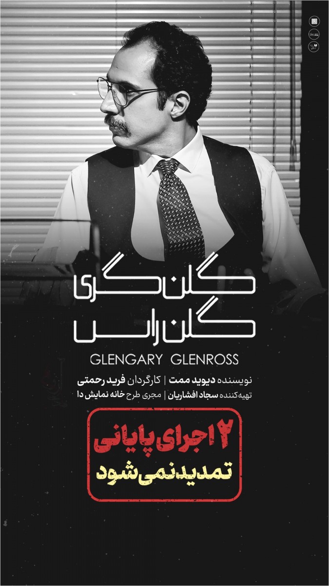 به نظر میرسد دغدغهمندی این اجرا بسیار فراتر از آن چیزی است که ممت در نظر داشته و میتواند بسط و گسترش یابد. وضعیت امروز جامعهی ایران ــ با تضادهای عمیق میان فردیت و جمع، میان فشار اقتصادی و میل به بقا، میان خواست شخصی و ساختارهای بیرونی ــ بستری آماده برای برجستهسازی لایههای زیرین این متن است. «گلنگری، گلنراس» میتواند فراتر از یک روایت دربارهی فروشندگان املاک در شیکاگو عمل کند و به روایتی دربارهی روابط کاری، اقتصادی و اخلاقی در بستر اجتماعی امروز ایران بدل شود؛ جایی که انسان در برابر بحرانها ناچار است مدام میان «ماندن» یا «از دور خارج شدن» تصمیم بگیرد.