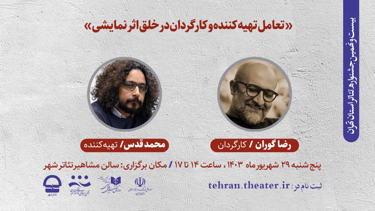 به گزارش روابط عمومی بیست و نهمین جشنواره تئاتر استان تهران، با حضور رضا گوران و محمد قدس کارگاه «تعامل تهیه کننده و کارگردان در خلق اثر نمایشی» در قالب این رویداد هنری و با همراهی مجموعه تئاتر شهر تهران برگزار میشود.