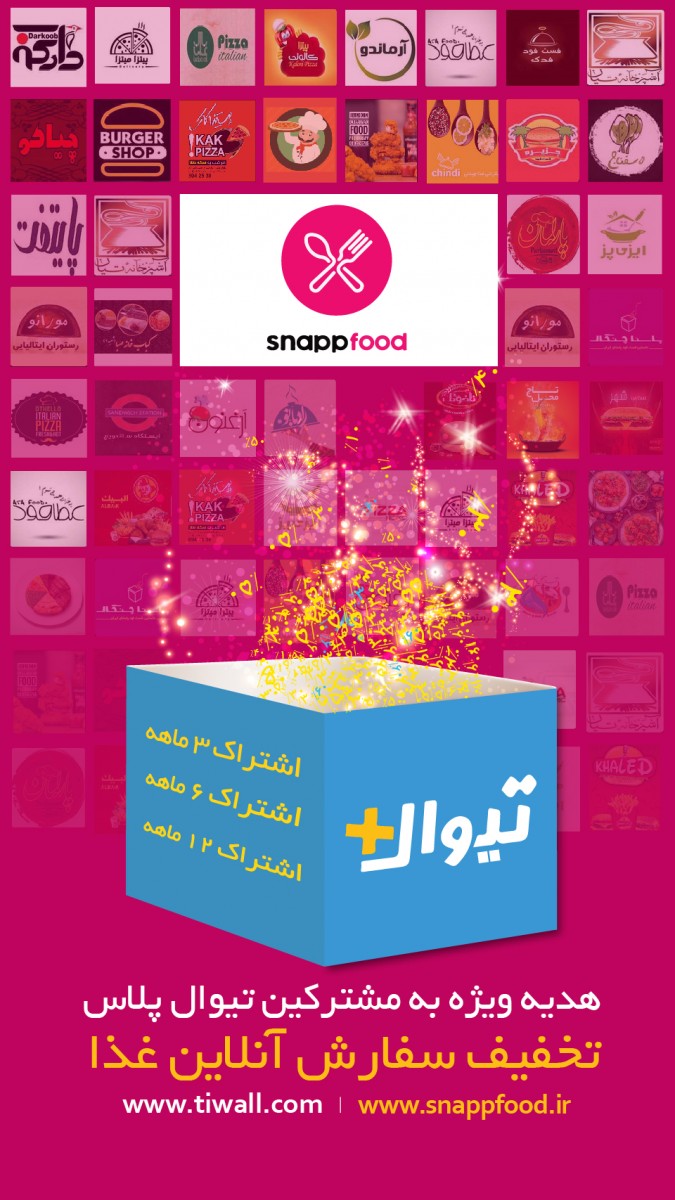 تیوال پلاستا ۵۰.۰۰۰ تومان تخفیف سفارش غذا از اسنپ فود ویژه مشترکان تیوالپلاسهمونطور که میدونید، اشتراک تیوالْپلاس به معنی بهرهمندی از همه خدمات آشنا و رایگان تیوال هست به اضافه مزایا و خدماتی که میتونه برای یک مخاطب فعالتر برنامههای هنری و گردشی خیلی مفید باشه. پیش از این بخشی از خدمات تیوالپلاس رو بهتون معرفی کردیم. همراهیها و هدیههای فیلیمو، اسنپ، دلیون و شهر کتاب آنلاین رو که یادتون هست؟ امکان ویژه دیگهای که در تیوالپلاس داریم سفارش آنلاین غذا از سایت اسنپ فود هست.