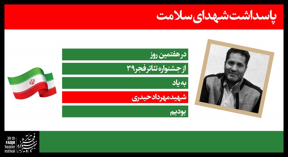 به گزارش روابط عمومی سی و نهمین جشنواره تئاتر فجر، در راستای تقدیر و تکریم شهدای مدافع سلامت و کادر درمان و پزشکی کشور در جریان مبارزه با بیماری کرونا، روز هفتم از اجراهای سی و نهمین جشنواره تئاتر فجر به شهید مهرداد حیدری از شهدای مدافع سلامت تقدیم شد. شهید مهرداد حیدری متخصص و جراح مغز و اعصاب و پدر دو فرزند ۴ و ۱۲ ساله بود که بر اثر ابتلا به کرونا در جریان خدمت به همنوعان خود آذر ماه امسال جان خود را فدا کرد. وی در هنگام شهادت ۴۳ سال داشت.